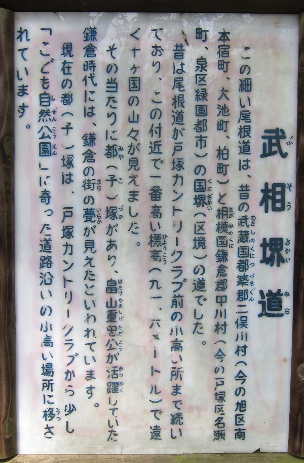 そして、緑の広場の横で、なんと武相堺道という石標と解説板を見つけた。国境の証である。横浜市内に残された貴重な緑のせいか、歩く人、走る人は多い。かつてはこの尾根の古道を多くの村人が生活や交易のために歩いたのだろう。南万騎が原駅付近では国境の尾根がすっかり破壊されていたために、これは余計に嬉しい。